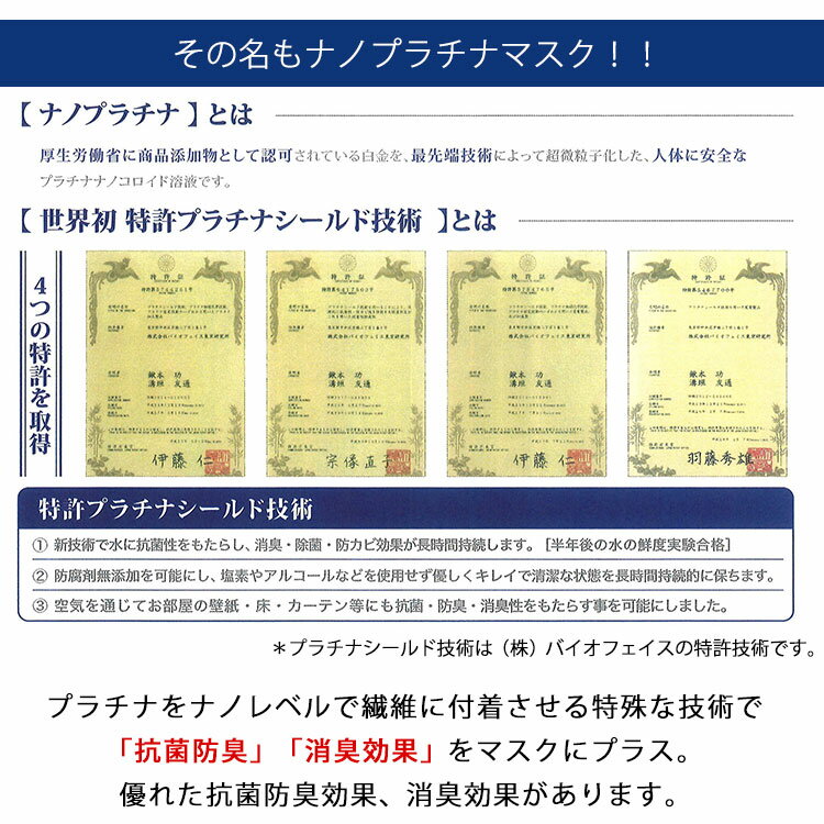 洗っても効果が持続する!抗菌防臭・消臭ナノプラチナマスク 3枚セット ナノプラチナマスク 大人用¥3,000(税抜) 10枚セット KN95規格マスク RESPIRATOR¥4,800(税抜) 4枚セット やわらかひもマスク¥2,000(税抜) 500ml×3本 オーガニックハンドジェル¥4,200 税抜) ■KEY WORD:マスク/mask/抗菌消臭/消臭効果/綿100%/感染/PM2.5/花粉/抗菌/洗濯可能/繰り返し/再利用/エコ/咳/くしゃみ/予防/花粉対策/子ども用/小学生/kids/キッズサイズ/予防/対策/飛沫/拡散防止/小学校/小学生/入学/始業式/